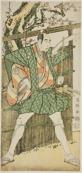 Katsukawa Shun'ei made this woodblock print in Japan in 1789. It depicts the actor Matsumoto Koshiro IV in a play at the Nakamura Theater. This print belongs to the ukiyo-e tradition, meaning ‘pictures of the floating world’. Ukiyo-e prints gained popularity in the Edo period, and they often represented transient pleasures, especially theater. The Nakamura Theater, where Matsumoto Koshiro IV performed, was one of the main theaters in Edo, now Tokyo. Theater was a vital part of urban culture, and actors like Matsumoto Koshiro IV became celebrities, whose likenesses were captured and widely distributed in prints like this. The print serves as a document of popular culture. It also offers a glimpse into the social dynamics of the Edo period, where the theater and its stars played a significant role in shaping public taste and trends. To understand more about this print, one could explore theater programs, playbills, and other ukiyo-e prints.