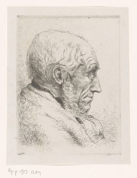 Editor: This is Hendrik Albert van Trigt's pencil drawing, "Nadenkende oude man," which translates to "Thoughtful Old Man," made before 1899. There's such vulnerability in this man's face, almost melancholic. How do you interpret this work? Curator: Indeed. Consider how the image resonates beyond the individual. The act of deep thought, here visualized with hand to face, is an ancient symbol, appearing across cultures to represent wisdom, grief, or contemplation of mortality. Notice how the artist uses the light and shadow to emphasize these elements. Is he questioning the present, mourning the past, or pondering the future? Editor: That's interesting. I hadn't thought about it in that broader context. The detail in his aged features – the wrinkles, the thinning hair – it all seemed so personal, specific to him. Curator: But consider, aren’t all portraits, to some extent, a symbol for humanity? Van Trigt captures an individual in a moment of profound thought, but through the symbols—the pose, the somber lighting—he invites us to contemplate universal themes: aging, memory, and the weight of experience. The texture and tonal shifts in the pencil work speak of an inner experience – notice the areas he’s returned to again and again, as if working through his own feelings about the man. Does that influence your initial impression? Editor: It does. It makes me think about how personal stories can become bigger, cultural stories too. There's a quiet strength in connecting the personal to the universal, I think. Curator: Precisely. Recognizing the enduring visual language helps us connect across time. These visual representations of psychological states persist, evolving but retaining their emotional core. What lasting impressions remain with you? Editor: I'm left with an appreciation for the image's layers—the immediate portrayal of a man in thought and the deeper symbolic meanings it evokes. Curator: As am I. It seems every glance invites us deeper into his reflection, but also into our own.