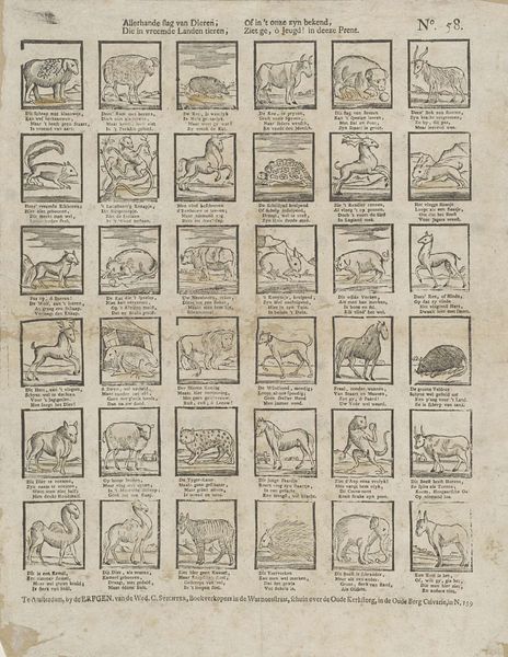 Curator: Immediately, I’m struck by the graphic simplicity and density of this print. So many animals packed onto one page. It almost feels like a naturalist’s sketchbook, but with a more formal arrangement. Editor: Indeed. Let's take a closer look at this engraving; the Dutch title translates roughly to “All sorts of animals, / That rage in strange countries, / Or are known in our own, / See, o youth! in this print." It’s from sometime between 1806 and 1830, by Johan Noman. Prints like these were designed to teach. Curator: Educationally oriented perhaps, yet formally delightful in its arrangement. Each creature exists within its own neat little frame, complete with verse! The visual rhyme created by this grid, paired with the contrasting textures of each animal, engages the eye. Editor: It absolutely reflects the colonial gaze popular during the period, one eager to display the known and imagined wonders from around the globe. The animal images derive from various popular and scientific publications of the day. Curator: Consider also the line quality. The engraver clearly sought precision but allowed for some freedom; note the fur textures on the bear or the scaled hide of what appears to be an armadillo. The print provides texture through controlled variance of line. Editor: The verse beneath each animal tells a small moralistic story, common to children’s primers of the era. It would be interesting to see if they reinforced or challenged the era’s attitudes toward nature and foreign lands. I would surmise, it’s about controlling both domestic and foreign "animals," figuratively and literally. Curator: I am compelled by the interplay of rational organization and near-fanciful depiction. It feels suspended between objective cataloging and artistic play. The image possesses scientific undertones blended with a decorative nature. Editor: Well, both approaches are valuable here. It provides insight into pedagogical tools while still providing a view into this period’s views toward science, art, and world views. Curator: Yes, the animal’s physical presence and representation here reveal 19th-century visual culture, and also provide a captivating picture.