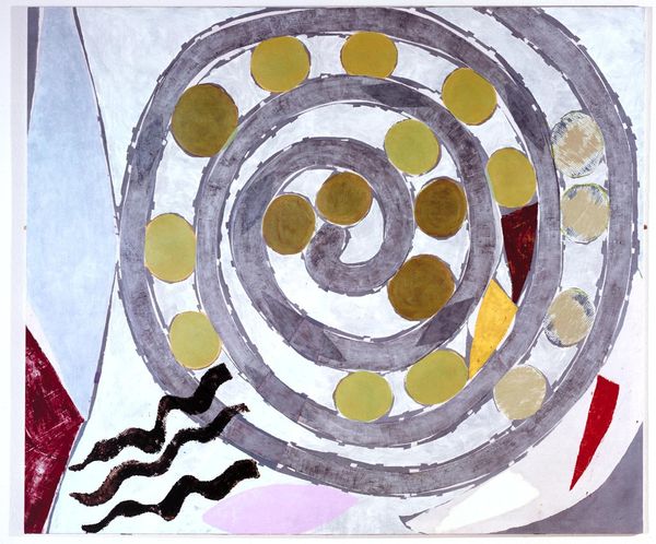 This playful gouache painting by Alexander Calder presents a dynamic composition of shapes and colors. The paint is applied in thin washes, allowing the white of the paper to peek through, creating a sense of lightness and spontaneity. Calder's process feels intuitive, like he's chasing after forms as they emerge. Look at the way the vibrant yellow shape, reminiscent of a banana, curves across the canvas, punctuated by irregular black spots. It's balanced by the swirling energy of the spiral, with its radiating lines suggesting movement and expansion. The texture is smooth, but the energy is palpable. This piece reminds me of Miró's playful abstractions, both artists sharing a love for simple forms and vibrant colors. Calder’s work invites us to embrace ambiguity and find joy in the unexpected.