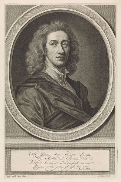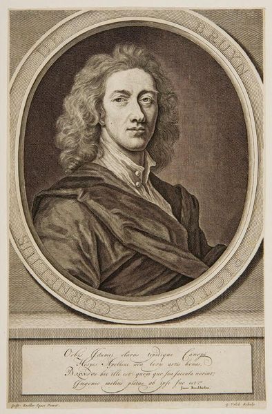This is Gerard Edelinck’s engraving of François Mansart, likely created in France in the late 17th century. It presents us with more than just a likeness; it's a study in social status and the role of the artist within the French court. Mansart, architecte du roi, is framed within an oval, a classical motif, immediately associating him with the prestige of antiquity and the French monarchy. The engraving technique itself, with its precise lines and attention to detail, speaks to the skill, labor and resources that went into the making of such images, usually reserved for those of high standing. The presence of Mansart’s coat of arms further underscores his social position. Art of this period was deeply entwined with power, reflecting and reinforcing the hierarchical structures of French society. To truly understand this image, we might consult period sources, such as royal inventories, architectural plans, and contemporary accounts of court life. These can offer a deeper understanding of the social conditions that shaped both the artist and his subject. The meaning of art is always contingent on its social and institutional context.