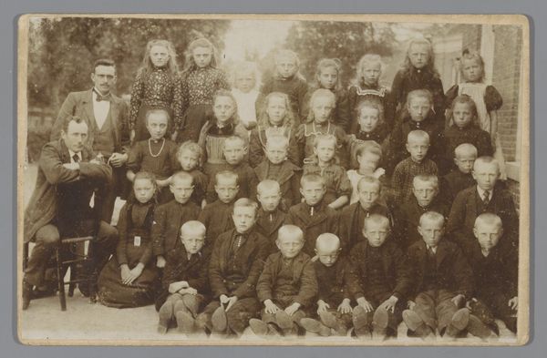 Curator: How haunting. All those pale faces staring out across the decades... it reminds me of those photos people used to take of supposed ghosts. Editor: This captivating piece, held here at the Rijksmuseum, is an anonymous photograph titled "Schoolfoto van kinderen met een leraar" — a school photo of children with a teacher, likely taken between 1880 and 1902. It’s remarkable, really. Curator: Remarkable in a sepia-toned, slightly unsettling way! I'm immediately drawn to the eyes. Some are defiant, some curious, and some seem completely vacant. It's as if they're staring through us, and maybe even beyond. Are these children already burdened by life, or am I just projecting? Editor: There is definitely a gravity to the photograph. I find it hard to ignore the fact that these images would've been posed for quite a long time, it definitely affected the expressions. Group photos like this would've carried a heavy symbolic load, reinforcing notions of community, shared identity, and social standing, maybe something of this is still evident in current day photo practices. Curator: Definitely a calculated mise en scène! All the children dressed so primly, attempting their best 'formal' faces for the camera. It feels so forced, and somehow also strangely intimate. The fragility of childhood set against the stark backdrop of social expectations...It's intriguing how we assign so much social meaning even to such a candid, momentary record. It’s a whole commentary, I suppose. Editor: Yes! Even their arrangement – the taller children behind, the smaller ones seated – reinforces a hierarchy. But that’s not all! We see glimpses of individuality, despite the attempt at uniformity: a slightly crooked bow, a rebellious lock of hair. Each of these can easily become symbols on their own. I think in these subtle disruptions to order we begin to see the essence of these unique beings shine through. The potential they might achieve on their own, when taken away from their rigid structure, like small bursts of freedom or excitement. Curator: I see what you mean. Despite the staged nature, a hint of the authentic slips through, doesn’t it? And doesn't it become something universal the longer you look at the photo... It also makes you think about all the vanished narratives behind the subjects on aged paper, stories long faded into the ether. Editor: Exactly. What legacies did they leave behind? In any case, what seemed a very somber capture reveals complex symbolic and emotional depth— a quiet, lingering echo of lives from long ago. I will be mulling it over all day!