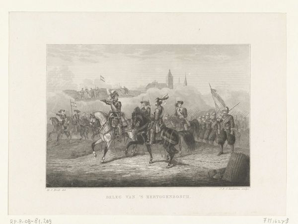J.B. Clermans created this work, "Harddraverij in het bos van Alkmaar," using an engraving technique that captures a vibrant scene with remarkable detail. The composition pulls us into the heart of the race through a central vanishing point, flanked by rows of onlookers and trees, creating a dynamic sense of depth. The monochrome palette emphasizes texture and form; the artist skillfully uses line and shading to differentiate between the bustling crowd, the elegant horses, and the dense foliage. Clermans' meticulous rendering invites us to examine the social spectacle and appreciate the graphic qualities of the work. Here, the artwork functions as a cultural document, providing a glimpse into 19th-century Dutch entertainment. Clermans captures the energy of the race, while simultaneously exploring the formal possibilities of engraving.