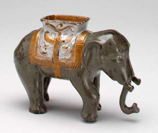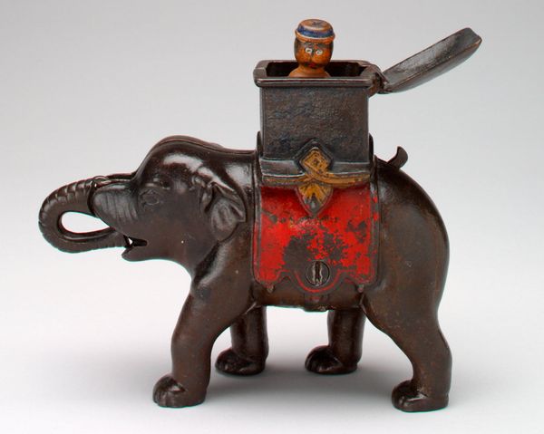 Curator: The patina on this little bronze elephant is just gorgeous; it speaks to years, perhaps decades, of handling. This is the "Elephant with Howdah," made in 1934 by the A.C. Williams Company, and it's currently residing here at the Minneapolis Institute of Art. Editor: It definitely looks… aged. I'm struck by the detail, though. It’s such a diminutive thing, yet they've managed to include so much texture and decoration in the saddle area and the elephant's blanket. What was the A.C. Williams Company known for? Curator: Exactly. They were a prolific American manufacturer of cast iron toys, particularly during the late 19th and early 20th centuries. This elephant is an interesting reflection on colonialism and power, you know? Elephants themselves have always represented those concepts, not just in Western eyes, but as a carrier of those in charge, particularly the imperial figures. It really invokes those narratives of control. Editor: It’s interesting how this humble object ends up embodying something so vast. Being mass produced, the use of bronze seems an elevated, surprising material decision. How does that material factor into the larger context, would you say? Curator: Bronze signifies wealth and permanence. But even within this bronze form, you have a kind of democratization, in the form of reproduction of status signifiers as affordable trinkets, as well as through casting methods. I think of how it circulates not only the symbolic, but actual goods throughout an expanding trade. It blurs the line between cultural symbol and commodity, reflecting the complexities of cultural exchange, especially in an era rife with socio-political exploitation. Editor: That makes me see this piece with completely different eyes. At first, I found its charm rooted solely in the smallness and the worn quality, that evidence of passing time, and of material, and yet there are such profound things packed within its making. Curator: Absolutely! I believe in looking at how art engages with larger global movements, shedding light on its historical, social, and even emotional effects across varied populations, through history and today. It enables understanding how symbols and power interact. Editor: This really demonstrates how the examination of an object, the materiality that constitutes its production, inevitably directs our eyes toward global conditions and structures. Thank you, this expanded my thinking of such a tiny, and very cute, historical artifact.