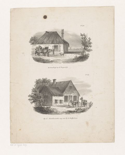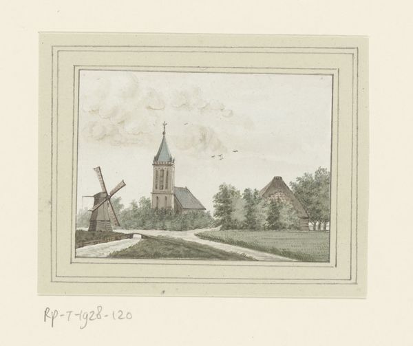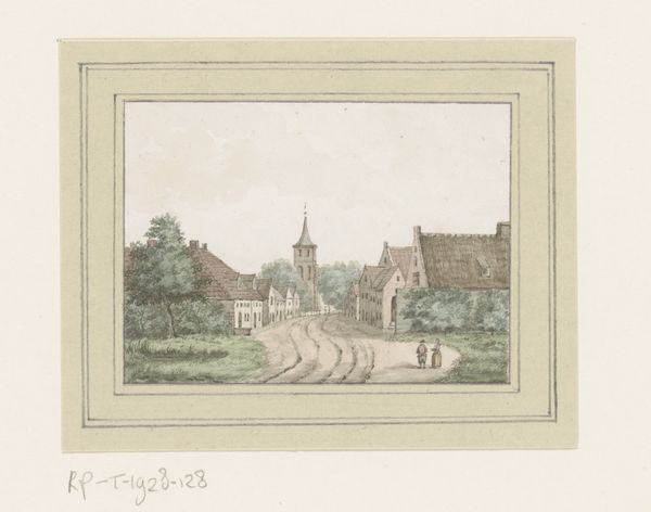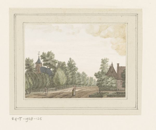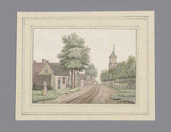 Curator: Let's discuss Carel Christiaan Antony Last's watercolor, "Figuren komen aanvliegen in een leeskabinet," created sometime between 1857 and 1876. Editor: Instantly, I’m drawn in by its peacefulness. There’s a gentle quality in the soft colors, almost like a dream of a quiet, rural space. Curator: The delicate use of watercolor is noteworthy, providing a contrast to typical notions about the value assigned to such modest mediums during the rise of industrial art production. Last was able to achieve realistic landscape and genre elements while using easily acquired material. Editor: It feels deliberately understated, doesn't it? There's someone on horseback and another with what looks like a small cart, but everything seems secondary to the church-like structure in the middle. There are also, dare I say, almost childish figures scattered around the grassy foreground... It's like peeking into someone's memory of a town scene. Curator: True, and in exploring genre and cityscape scenes within the tradition of realism, Last captured elements from daily life. Notice how labor is pictured? A simple structure, surrounded by pastoral markers; all this reinforces ideas related to labor being foundational. Editor: Yes, now that you point that out! There's this tension. The idyllic setting—trees, farm animals— juxtaposed with the figures seemingly working, which perhaps touches upon larger questions about how communities were maintained? The art highlights an era just as industrial modes began overshadowing many such rural settlements in Europe. Curator: Precisely, this aligns with trends within realism to illustrate ordinary moments, a snapshot of society amid the flux of progress. These are elements we consider as intrinsic building blocks for the socio-economic picture during the rise of modern economies and social structures. Editor: Looking again, I'm left with this wistful impression. Like seeing something beautiful just before it fades, perhaps signifying transition periods reflected across rural cultures during the time. Curator: An insightful interpretation! Thank you for helping enrich our viewers’ perspective regarding labor in Last’s painting. Editor: It’s been a pleasure digging beneath the artwork! Always an honor.
