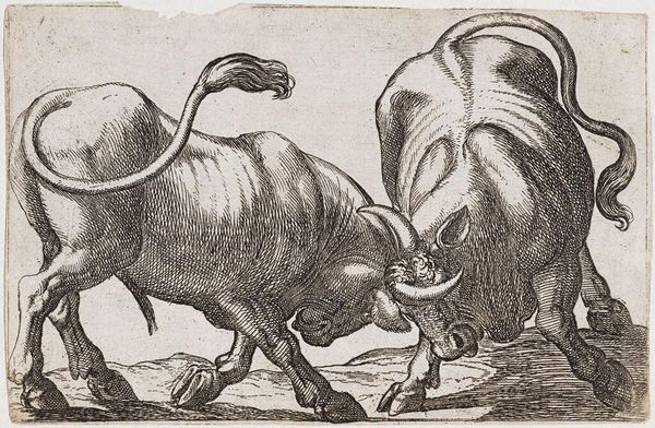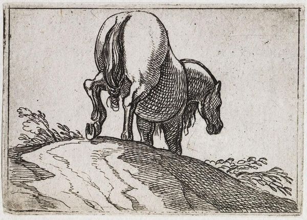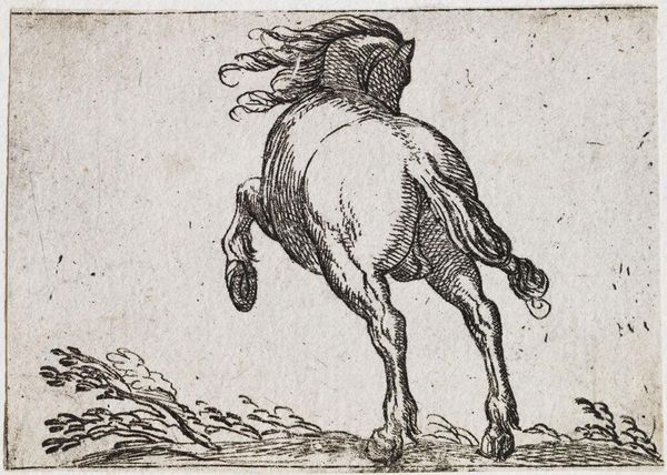 Curator: Here we have "Charging Horse Viewed Frontally," an engraving by Antonio Tempesta. Tempesta, who lived from 1555 to 1630, captures a remarkable tension in this piece. Editor: That horse looks like it's about to step right out of the frame and into your personal space! The energy is palpable. Curator: Indeed. Note the density of line work, particularly around the musculature. The engraving technique creates a rich texture, almost vibrating with implied movement. Editor: And the mane! It’s practically exploding with dynamism. It's as if Tempesta bottled pure, unadulterated equine spirit. Curator: Precisely. We observe a skillful manipulation of form to evoke a sense of forceful propulsion. Editor: It's more than skillful; it’s almost reckless. Curator: Perhaps. It is this tension between restraint and exuberance that makes this piece so compelling. Editor: It's a fascinating little dance between control and chaos. Curator: A dance that speaks volumes. Editor: Exactly! A tiny etching with such a massive personality.