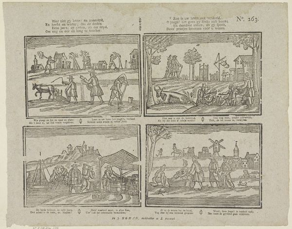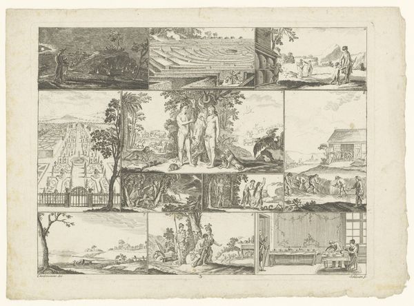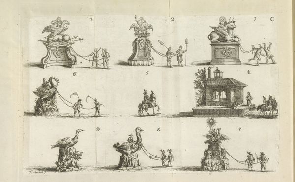Curator: This etching by Pieter Wauters, created in 1767, is entitled “Blad K: zeventiende en achttiende praalwagen.” The print depicts baroque floats and elaborate structures, hinting at celebrations and perhaps processions of some kind. Editor: It's immediately striking how detailed the drawing is, despite its relatively small scale, almost like an array of intricate architectural models. The contrast of light and shadow gives them depth, despite being printed on a two-dimensional plane. Curator: Absolutely. When we look closer at each individual section of the print, what becomes evident is how Wauters situates each float or structure within the larger context of seventeenth- and eighteenth-century societal spectacle, exploring its roots in traditions of power, and maybe colonial fantasy as we see with the Camel section, where the characters surrounding the animal wear almost stereotypical native clothes. Editor: Yes, the way each form relates to another on the page also reveals patterns of scale, weight, and proportion. Consider, for example, how the structure at the bottom-left echoes the pavilion on the float with an almost mathematical perfection, yet remains distinct. The details on the animals feel less stylized and more grounded than those in the figurative depictions. Curator: Looking at it from a feminist point of view, I find myself questioning what is not shown. What roles were women relegated to, what labor supported such opulent display, what colonial resources fueled them, and how can we use that perspective today. Editor: That's a very interesting way of considering that the etching as a construction, just like the pageant wagons that appear. Perhaps what we're really considering are the layers of symbols that operate formally to reinforce power in their relationships, which are further contextualized and complicated as social reflections and historic record. Curator: By bringing together these considerations of societal forces and detailed technique, we start to have a broader sense of how the art of Pieter Wouters reflected its contemporary time while also allowing a look at some less exposed underpinnings. Editor: I appreciate seeing how each symbolic object adds to our structural understanding of the piece, like looking through a beautifully illustrated historical record.