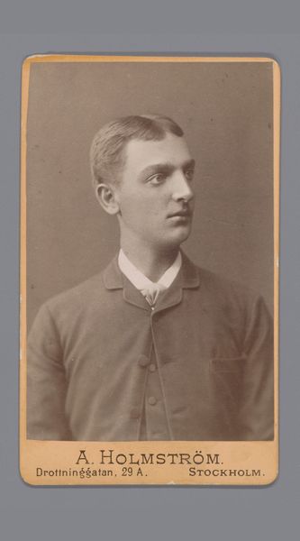 Gustaf Alfred Johanson Dahllöf captured this young man's portrait with a camera, in a sepia-toned photograph. The oval frame centers the man, drawing our eye to the subtle gradations of light and shadow on his face and suit. The composition is meticulously structured: the rigid lines of his jacket contrast with the soft, rounded edges of his face and collar. Dahllöf uses the semiotics of clothing to convey a sense of formality, yet the gentle gaze and slightly parted lips hint at a more vulnerable, human presence. The sepia tone mutes the colors, emphasizing tonal relationships, and perhaps suggesting a deeper contemplation on the passage of time. Dahllöf masterfully employs the formal elements to create a structured yet subtly expressive image. The photograph functions as a cultural artifact, reflecting societal values and the emerging role of photography in shaping identity.