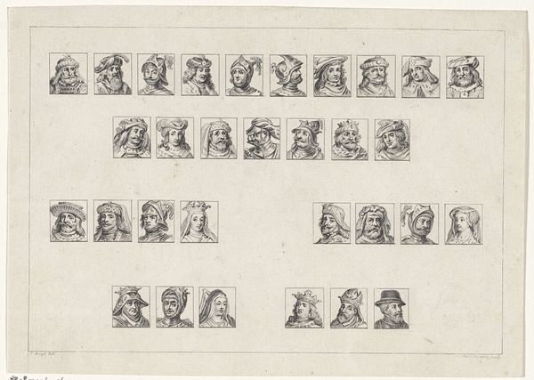 Editor: This is *Vierentwintig koppen van mannen*, or *Twenty-Four Heads of Men*, a graphite and engraving print by Daniel Nikolaus Chodowiecki, created in 1774. The delicate lines give it a very classical feel. I’m struck by how uniform yet individual each face is. How do you interpret this work, given the social and historical context of the late 18th century? Curator: This piece resonates deeply when we consider the Enlightenment ideals that were taking hold. Chodowiecki, working in a period defined by reason and observation, presents us with what seems like a study in physiognomy. Are these ‘types’ reflective of societal roles and power dynamics, reinforcing class structures through visual representation? The numbered heads encourage us to categorise, to analyse—but on what basis? Editor: That's fascinating! So you’re suggesting it’s not just a neutral observation, but a commentary on how society classifies people? Curator: Exactly. The neoclassical style, with its emphasis on order and rationality, here intersects with potentially problematic social theories. Where do you think these presumed archetypes draw their authority? Editor: Perhaps from the existing social hierarchy. The piece subtly reinforces who holds power just by depicting them in a certain light? Curator: Precisely. And we need to question whose gaze is doing the depicting. Whose 'reason' are we seeing reflected? How might the identities of the subjects – their race, class, and social standing – play into how we view this grid of faces today? Editor: This really changes how I see the piece. I'll definitely be thinking about power structures when I look at art from this period. Curator: And about whose stories aren't being told, whose faces are missing from this very selective representation of the populace.