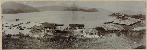 Editor: So, here we have Woodbury and Page's photograph, "Macassar," taken sometime between 1863 and 1869. It's an albumen print, and the sepia tones give it such a classic feel. I'm immediately struck by the way the image is composed. It's a landscape, but there's a definite sense of depth created by the buildings, the flagpole, and the mountains in the distance. What do you see in this piece, from an iconographic point of view? Curator: What fascinates me is how the photograph encapsulates a moment of cultural encounter and control. Look at the imposing flagpole at the center, with its web of ropes like a spider's silk. What could that possibly symbolize? Editor: I’m not sure, dominance, perhaps? Curator: Indeed! Now, notice how it bisects the image, neatly separating the architecture on the right – classic colonial style – from the more indigenous structures in the middle ground with a small, thatched roof, a completely different style. What do you imagine went through the colonizers minds when establishing such architecture in colonized land? Editor: Well, I suppose establishing a strong visual presence must have been crucial for asserting power and control... Curator: Precisely! It’s about creating a visual language of dominance, embedding a sense of permanence and superiority in the landscape. Editor: It's amazing how much history and power dynamics are packed into a seemingly simple image. Thanks for shedding some light on these colonial symbols! Curator: My pleasure. Remember, images are never neutral. They are imbued with cultural memories and encoded meanings, just waiting to be decoded.