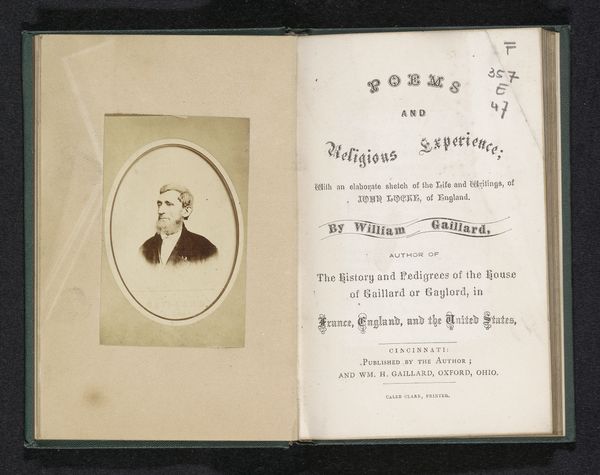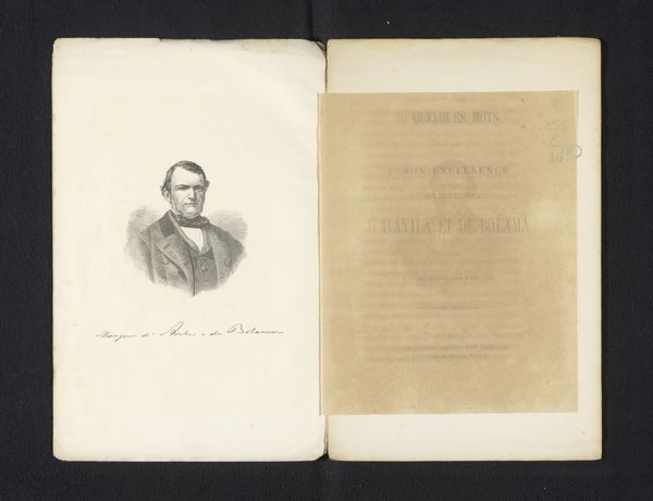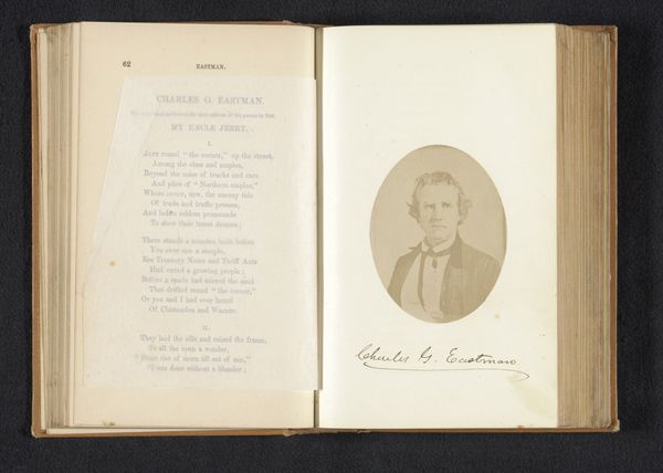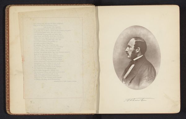 Curator: This artwork, dating from before 1864, is entitled "Portret van Robert Hamerling" by G.F. Krauss. It seems to be a drawing. Editor: It's incredibly delicate. Almost sepia-toned with that aged paper. The sketch appears thoughtful, conveying a quiet, almost melancholic mood. Curator: Considering the social history of portraiture at the time, its presentation is important; placed inside a sketchbook alongside written text suggests the confluence of the visual and literary arts within a burgeoning artistic and intellectual public sphere. The work uses a blend of pen, pencil, and photography. What can we decipher from this intermingling? Editor: Immediately, I see how gender impacts these portraits. Hamerling seems constrained. I would look at contemporary theories regarding visibility and representation to see what type of social messaging emerges. He almost seems staged in his pose. Curator: Well, portraiture in this era served very specific purposes, mainly as records and declarations of status. Understanding how Kraus operated within specific institutional contexts and aesthetic traditions can shape my understanding of who Hamerling might have been and what segment of society he was a part of. The placement beside text in this specific context serves the image making; what status can be gained through image? Editor: The relationship with the written work is interesting; one may wish to challenge this work through contemporary literary criticisms to expose or uncover assumptions that underpin textual and artistic convention during the time, to ask why it was created and whose purposes it was created for. The integration into a journal allows this purpose to appear organic, instead of political or socially motivated, thus possibly making this all the more dangerous. Curator: That interplay of visibility and representation is very crucial. Understanding these nuances grants us a window into the art world as it once was and it gives some degree of modern impact. Editor: This piece invites more interrogation, and a consideration of historical power structures with the hopes of social empowerment through awareness. Curator: Exactly, an important intersection for any student of art!