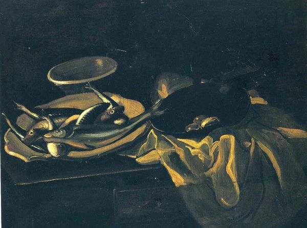 Editor: This is a detail from Matthias Grünewald’s “The Concert of Angels,” painted around 1515, using oil paint. I’m really struck by the sense of quiet and anticipation here. It’s so still and… domestic, somehow. What draws your eye when you look at it? Curator: It's the very stillness you mention, juxtaposed with a profound sense of mystery, isn't it? These ordinary objects – the washing basin, the pitcher – become charged with significance when considered alongside the celestial. Grünewald was a master of imbuing everyday life with the spiritual. Have you ever considered how textures seem to take on lives of their own? Editor: I think I see what you mean! It’s almost hyper-real, the way the light catches on the wood. The folds of the cloth feel so tangible. Curator: Precisely! The artist isn't simply depicting a scene but inviting us into an emotional landscape. What do you feel when looking at those very detailed humble objects that are next to appear to be regal objects? Does it create a certain friction, perhaps even a kind of sacred tension? Editor: Definitely, it’s this clash between the mundane and, well, whatever grand scene this is taken from – the name "Concert of Angels" gives a hint of that. I hadn’t considered that it could be on purpose to evoke something more! It really feels like a backstage moment, preparations being made for something immense. Curator: Precisely, or maybe more personally – an invitation into intimate space. Grünewald asks us to consider holiness residing in the most unassuming moments. A rather rebellious sentiment to hold at the time, don’t you think? Editor: I hadn’t thought of it like that! That tension gives the painting an unexpected… edginess, even now. Curator: Indeed. Art of the past continuously manages to be relevant in the future, does it not? Editor: It definitely gives me a lot to think about – everyday moments as potentially profound. It makes you wonder what we overlook.