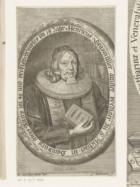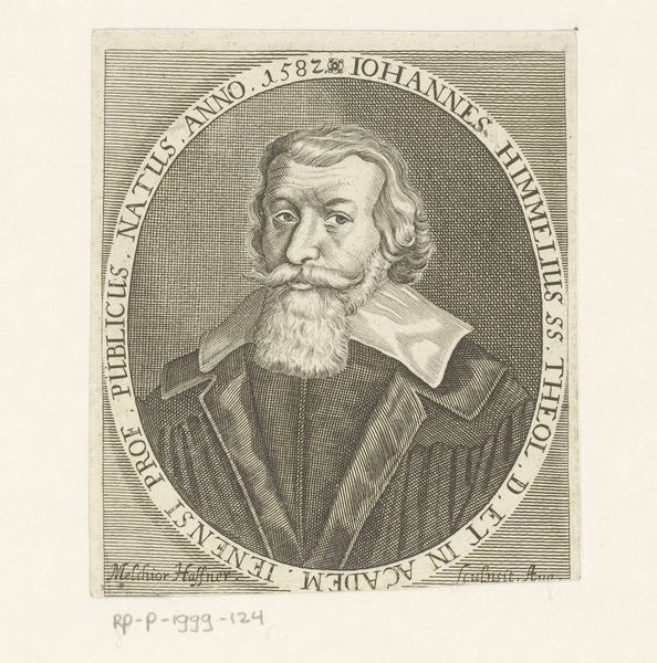 Editor: Here we have "Portret van Thomas Wegelin op 52-jarige leeftijd," an engraving by Jacob van der Heyden, possibly from sometime between 1629 and 1645. The subject’s ruff collar is striking, it makes him look so formal. What do you see in this piece? Curator: Beyond the individual depicted, I see a potent reflection of power structures of the era. Notice how the inscription surrounding Wegelin subtly reinforces his status— "Canon of Augsburg". This engraving, produced within a specific social and historical context, normalizes and reinforces existing hierarchies. How does understanding the cultural environment affect how you perceive Wegelin's image and the function of portraiture during the Baroque period? Editor: That's interesting. So you're saying it's not just about Wegelin as a person, but about the social forces at play at that time? How would someone challenge or subvert such systems? Curator: Precisely. Recognizing that the image itself contributes to the canonisation of specific individuals encourages you to analyze who *isn't* represented and whose stories are marginalized. Artists, even within established genres, can utilise techniques—satire, hidden symbolism, or focusing on different subjects entirely—to subtly critique prevailing ideologies. Doesn’t that add another layer to this rather conventional portrait? Editor: It completely does! I had only thought of the technical skill involved in the engraving, but understanding its historical role gives it so much more meaning. Curator: Exactly. Context is critical! Considering the portrait’s historical roots encourages reflection on how representation reinforces and resists authority today. Editor: I will definitely consider the social environment around art in the future; I learned so much. Curator: As did I. It's these discussions that deepen our appreciation and critical understanding of art.