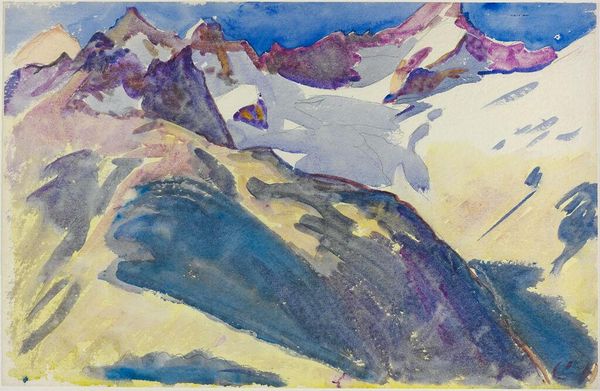 Curator: The piece before us, titled "On the way to Shekar Dzong," was completed by Nicholas Roerich in 1928 using oil paint in plein-air style. What's your immediate response to this work? Editor: I'm struck by its cool tonality, it feels both vast and muted. The mountains, though imposing, seem almost ethereal, like a fading memory rather than a solid mass. Curator: Roerich's compositions often play with a flattened perspective. Note how he minimizes detail and relies on geometric forms and linear structures to define the landscape. It simplifies the pictorial space, emphasizing symbolic essence over mimetic accuracy. Editor: Yes, I find the severe geometry contributes to its sense of stillness, of something timeless. Given the socio-political climate of that era, one wonders if that austerity mirrored an atmosphere of quietude amidst change, reflecting the search for permanence amidst upheavals. Curator: Indeed. Roerich was deeply influenced by Theosophy, and aimed to imbue his art with spiritual significance, presenting a mystical East accessible to Western viewers. Look how the subtle gradations in color—the interplay of lilac and ochre—convey a sense of transcendence. This elevates what would have otherwise been a simple plein-air landscape into something symbolic and otherwordly. Editor: That elevation of the mundane definitely reflects the era’s interest in Eastern spiritualism, positioning these remote landscapes as sources of profound enlightenment, ripe for appropriation. And you know, in 1928 Roerich founded the 'Urusvati' Himalayan Research Institute, indicating his commitment to the region's social and cultural significance as well. Curator: The painting seems less about representing a geographical space, but the feeling of seeking something greater, that transcendent state of mind and experience, captured by a delicate balance of colors and form. Editor: So it's a piece that reminds us that a work’s artistic value is as influenced by philosophical underpinnings as by the social and political climate, even those perceived as objective renderings. Curator: Precisely. These mountains of the mind also are part of this world, expressed here with sublime formalism.