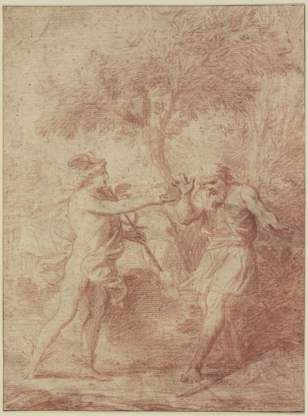 Jan Thomas created this drawing, "Couple in Garden," with pen and brown ink, and gray wash. The monochrome palette directs our gaze to the formal structure of the composition. See how the artist uses a delicate network of lines to define the figures and landscape. The strokes vary in weight, creating a sense of depth and shadow. The couple is framed by the natural architecture of the garden, yet it's the asymmetry that truly captivates. The male figure is more dynamic, reaching upwards, while the female figure is rendered with more subtle, flowing lines, creating a visual contrast between action and contemplation. Consider how Thomas uses the conventions of garden imagery not just to represent an idyllic scene, but to explore the relationship between form and emotion through the visual language of line and shade. The drawing invites us to decode its formal elements and consider how they contribute to a larger discourse about beauty and human connection.