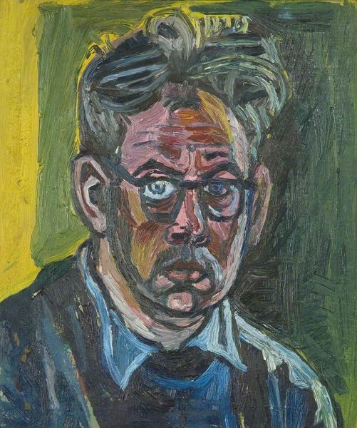 Editor: So, this is Cyprián Majerník’s "Crying Clown," painted in 1940, using oil paint. The exaggerated features and mournful expression are striking... How do you interpret this work? Curator: This portrait demands that we look beyond the surface, doesn't it? Majerník painted this during a period marked by political upheaval and personal turmoil in Europe. I see the 'clown' not as a simple entertainer, but as a symbol of the artist himself, or perhaps even broader, a stand-in for a population enduring hardship. The exaggerated, almost grotesque features become a mask, concealing deeper vulnerabilities. Consider how the grotesque became a tool for social and political critique in art, challenging dominant representations of beauty and normalcy. Does this shift your perception at all? Editor: It does! I was initially focused on the sadness in the expression, but knowing the historical context, it seems like more of a commentary. Were there other artists doing similar work? Curator: Absolutely. Think of the Expressionists and their unflinching depictions of suffering, artists who were processing collective anxiety. By rendering the figure as a 'clown,' Majerník perhaps found a subversive way to voice dissent. We can explore how identity is not a fixed attribute but a fluid performance shaped by social and historical circumstances, can’t we? Editor: It's amazing how much history and theory can unlock in a single painting. Curator: Precisely! Looking at the art, we uncover not just the aesthetic choices of an individual, but a visual record of societal tension and the quiet resistance embedded within the canvas.