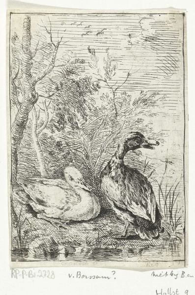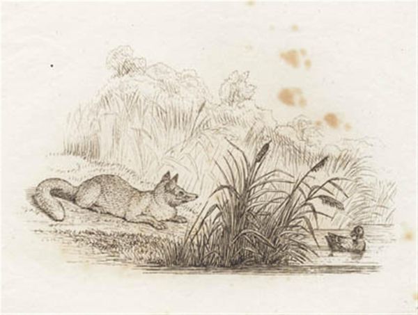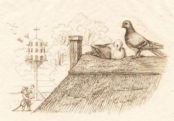 Editor: This is an engraving, or perhaps a print of a pencil sketch, by Martinus Rørbye, created in 1834, titled "Illustration til 'Halvhundrede Fabler for Børn' af Hey". It has a very delicate, almost fragile quality. The composition leads the eye from the figure and birdhouse on the left to the birds on the rooftop to the right, but overall it is a bit… unresolved. What do you see as significant in this piece? Curator: The immediate draw for me lies in the contrasting textures achieved solely through line work. Observe how Rørbye distinguishes the smooth feathers of the doves from the coarse thatch of the roof using only varying densities and directions of engraved lines. The overall tonality and delicacy reinforce the themes inherent to Romanticism. Note the almost ethereal rendering of the distant trees and birdhouse, suggesting a nostalgic yearning for nature, which are key. How does the limited tonal range affect your perception of space? Editor: I think it flattens the space, actually, drawing my attention instead to the detailed hatching on the roof, which almost becomes the primary subject despite the birds being higher. Curator: Precisely. It disrupts the conventional illusion of depth, prioritizing surface and texture. That subversion of traditional perspective, redirecting the viewer’s focus to the material qualities of the engraved line itself, emphasizes its structural role in conveying meaning, an emphasis we see in the avant-garde movements that follow Romanticism. Editor: That's interesting. So, looking at the composition, material and its structural use tells a different story than what I originally perceived as just an illustration. Curator: Precisely, appreciating how those components construct a narrative that extends beyond a simple scene into considerations about materiality, perspective, and early explorations into abstraction. Editor: I've certainly gained a new perspective on this piece, looking at its techniques and how the material constructs the artwork. Curator: Indeed. It reveals how form shapes content, challenging our initial assumptions about artistic intent and visual language.