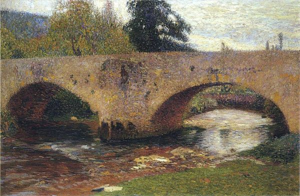 Curator: Henri Martin gifts us this captivating vista called "The Green Bridge." Editor: Immediately, it evokes a humid afternoon, all dappled light and the thick, palpable stillness that hangs heavy before a storm. Curator: Indeed. The surface crackles with tiny, furious strokes. Oil paint, applied "en plein air," capturing that fleeting moment. What do you make of the…greenness? Editor: The materiality of the paint contributes to it—the dense build-up around those bridge arches creates a sense of mass and dampness. Look at the visible labor: brushstrokes mirroring the flow, the churning, almost reflecting the very act of painting. I wonder, what pigments were layered to give such luminescence? Curator: It’s about seeing, not just rendering, isn't it? The river, reflecting the sky…a constant dialogue between above and below. I find it meditative. What could Martin possibly have been pondering, watching it unfold? Editor: Meditative perhaps, but bridges themselves are never neutral. Consider who is allowed to cross, and who builds them in the first place. Labor—usually unseen, uncelebrated—literally holding communities together! Curator: You always bring me back to earth! Perhaps the artist just sought that fleeting union of human-made structure with nature. That quiet grace. I keep imagining a solitary figure walking across the bridge at dusk. Editor: Right, but it’s the stone, quarried, shaped, and set that arrests my gaze. Look how the labor leaves a visible residue, as if its very means of construction reveals a certain…social stratification. Curator: You've certainly painted a different picture. Editor: We just both add nuance to this compelling portrait. Let's not simplify an artifact laden with human intention.