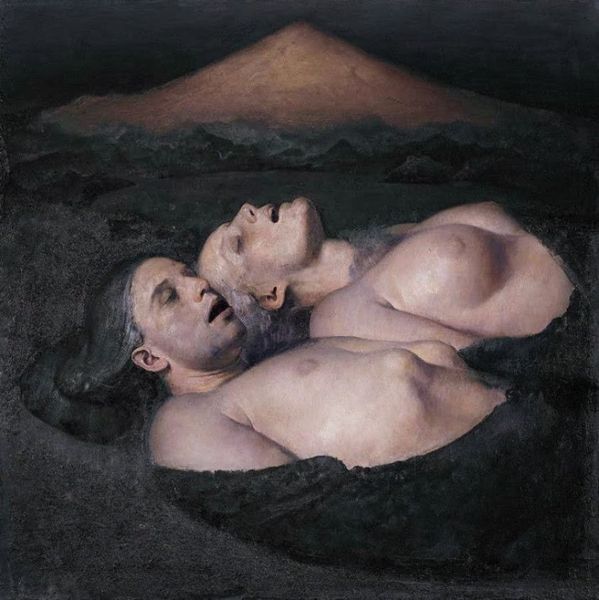Curator: Let’s examine this arresting canvas, “Old man with a dead maiden” by Odd Nerdrum. The neo-expressionist work utilizes oil paint to render a scene both intimate and desolate. Editor: My initial response is one of stark isolation. The somber hues and raw figures evoke a profound sense of despair and loss. The expressions on the faces...chilling! Curator: Absolutely. Note how Nerdrum manipulates the materiality of the paint itself, building thick impasto layers in certain areas to create tactile texture, especially on the bodies, while keeping others relatively smooth. Consider, also, the conditions of production; his deliberate return to the craft-based approach of the Old Masters amidst contemporary art movements makes a statement about his priorities. Editor: Indeed. And from a historical perspective, works like this, with their blunt figurative style and references to mortality, served as counter-narratives to the slick commercialism that began dominating art institutions at the end of the twentieth century. There is an active rejection of polished appearances here, it's very visible to me. Curator: It’s a tangible manifestation of the artist wrestling with the burden of representation, as seen from an outsider position, and also very rooted in a socio-political context. The choice of subject matter, focusing on mortality and vulnerable bodies, is no accident; these choices underline and underscore the raw materials' value. Editor: Precisely. How audiences reacted to it critically, I wonder, with such unapologetic presentation of humanity in crisis, and in what ways this neo-expressionist direction echoed, or reacted against, previous depictions of similar scenes. What type of statements would have people produced from these interactions! Curator: Food for thought indeed! The interplay between raw materiality and the artist's intent undeniably complicates easy readings. Nerdrum presents a defiant and demanding form of labor, creating an intriguing object. Editor: Indeed! And contemplating how society's perception has evolved since its creation opens avenues to new meanings embedded into the reception process as well! Curator: Indeed a captivating work with multi-layered reading, even with time passing. Editor: A powerful painting; this analysis has definitely enriched my understanding!