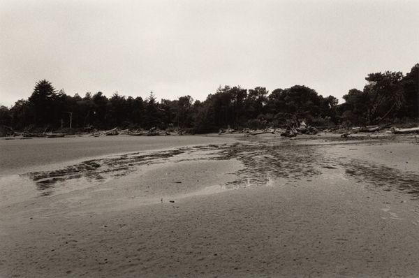 Editor: This is Robert Adams’ "The River's Edge," taken in 2015. It’s a gelatin silver print and the monochrome really sets a quiet, contemplative mood. What do you see in this piece? Curator: I see a meditation on cycles of time. The bleached driftwood, almost skeletal, evokes a sense of mortality against the backdrop of enduring natural forms—the river, the distant mountains. Notice the almost archetypal stillness, and ask yourself what emotional truth it holds. Editor: It feels like a contrast between something very old and something permanent. Curator: Exactly. And what visual elements contribute to that feeling? Consider how the arrangement of the driftwood relates to those lines of pebbles leading to the river... Editor: They seem like markers, almost like pathways or stepping stones across time, like you are supposed to follow them to someplace. Curator: Precisely. Think of the enduring symbolic weight of water and stone: sources of life and resilience. Adams is positioning our moment as participants in this cycle, witnesses of decay and regeneration. Do you notice a connection to older Vanitas traditions here? Editor: Now that you mention it, the driftwood almost resembles a skull, reminding us of our own mortality. I never would have noticed it. Curator: It’s subtle, but potent. Ultimately, this image operates on multiple levels, inviting us to contemplate not just the scene before us, but also our place within the grander scheme of existence. Editor: I see that now. The landscape is not just a scene, but an emblem, heavy with symbolic association. Thanks, I will consider those older symbolic meanings going forward.