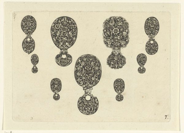 Editor: So, this print from 1695 is titled *Negen ontwerpen voor juwelen*, or Nine Designs for Jewels, created by Joseph Friedrich Leopold. It’s made using etching. I'm really struck by how meticulously detailed each design is, they seem to be floating on the page. How do we contextualize this sort of design work? Curator: Well, considering its social context, the Baroque era, we see the glorification of the aristocracy playing out. Designs such as these weren’t merely decorative, they signified wealth and status, contributing to a carefully curated public image. Consider where jewelry design and display was centered: often within court circles, where power was performed daily. How might these elaborate patterns and motifs reinforce those performances? Editor: So, these weren’t just pretty pictures; they were visual statements of power? Were these designs actually made, or were they aspirational? Curator: That’s the key question. Design prints like this circulated amongst artisans and potential patrons. The fact that this print exists suggests a growing market, a democratization of luxury, though still obviously limited to those who could afford to commission such intricate pieces. Are we looking at a direct instruction, a marketing tool, or even something in between? It might be intended as inspiration or evidence of what workshops could achieve, influencing future designs, tastes, and manufacturing trends. Editor: So, by studying the print itself, we get a sense of both the artistic skill and the social landscape of the time? It feels like the history is embedded in each line and curve. Curator: Precisely! The aesthetics of an artwork become historical documents when critically analyzed. Editor: Thank you. This has really broadened my understanding of how to approach works like this. Curator: Likewise, thinking through these elements is a helpful reminder to stay vigilant to the social narratives shaping the art.