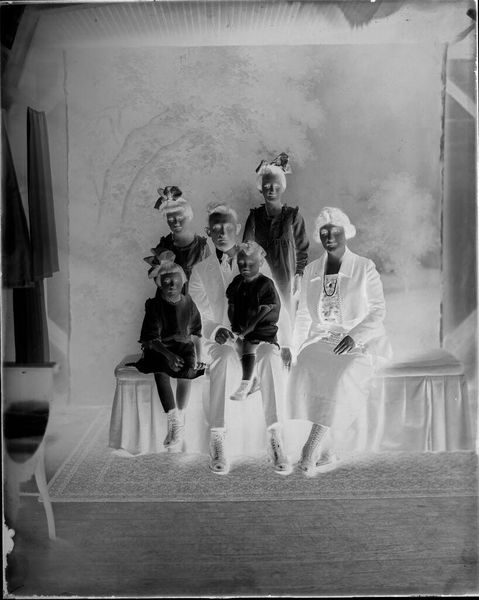 Editor: Here we have an untitled family portrait by C. Bennette Moore, a silver gelatin print with rather striking contrasts. What stands out to me is the use of the large tree as both a backdrop and a compositional element. What do you make of its structure? Curator: Indeed, the tree's branches serve as a visual counterpoint to the figures, creating a complex interplay of lines and forms. Consider the tonal gradations, shifting from the dark voids of the tree's interior to the lighter figures, constructing a dynamic visual rhythm. How does this arrangement affect your perception? Editor: It almost flattens the space, pushing the figures forward. The reversed contrast creates a dreamlike quality. Curator: Precisely. The manipulation of light and shadow, characteristic of photographic negatives, generates a visual tension between representation and abstraction. Does this disrupt or enhance the narrative for you? Editor: It definitely adds another layer of complexity! I see the contrast and form much more clearly now. Curator: Excellent. The composition offers a powerful study in contrasts and invites deeper contemplation.