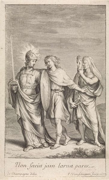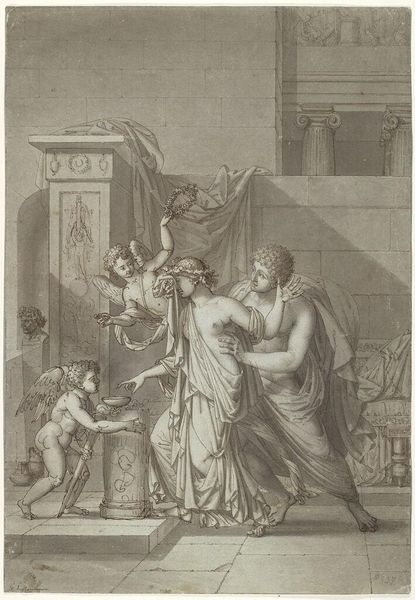 Editor: This print, "Woman Accompanied by Four Persons" by Francesco Rosaspina, has such delicate lines. It reminds me of classical friezes. What can you tell me about it? Curator: Consider the engraving process itself. Rosaspina, active during a time of significant social upheaval, was essentially mass-producing images. How did this accessibility change art's function and meaning for the wider public versus elite patrons? Editor: So, it's less about the narrative and more about how the print was made and consumed? Curator: Exactly. Think about the labor involved and the distribution networks. This print democratizes art, transforming its cultural value by making it readily available. Editor: That perspective shifts everything. I hadn't considered the printmaking process as a social force. Curator: Seeing art as a product of material conditions allows us to understand its role within society.