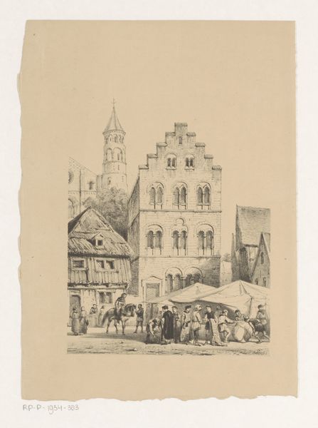 Willem Adrianus Grondhout created this etching of the Stadhuis van Delft. Grondhout was a Dutch artist whose work often depicted cityscapes and landscapes. This artwork offers a glimpse into early 20th-century Delft, capturing the architectural grandeur of the Stadhuis. The figures animate the scene; they are reminders of the everyday lives unfolding against the backdrop of history. Grondhout's choice of subject matter reflects a broader artistic interest in documenting urban spaces, while also suggesting a sense of national pride. The etching technique gives the artwork a detailed quality. The contrast between light and shadow accentuates the architectural forms of the buildings and evokes a sense of nostalgia for a bygone era. Consider how the act of etching itself transforms this public space into an intimate reflection on time, place, and memory.