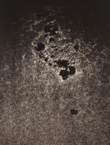 Editor: This untitled work is by John Beard and held in the Tate Collections. The contrast between light and dark is so striking, almost violent. What do you make of it? Curator: The stark juxtaposition certainly commands attention. The meticulous application of tone, the gradations within the black void, suggest a deliberate formal tension. Note how the surrounding texture, almost pixelated, interacts with this central mass. Do you perceive a figure-ground relationship? Editor: I do, yes, it almost feels like a figure is emerging from a digital landscape. Curator: Indeed. The piece invites contemplation on the nature of representation itself, and the interplay between form and perceived content. Editor: This has certainly expanded my understanding of its composition. Curator: Mine too.