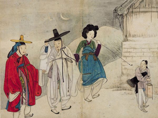 Nakamura Hōchū created this print, "Two Gods of Fortune and a Temple Dancer," in the late 18th or early 19th century, a period of cultural and economic change in Japan. The artwork presents a trio engaged in what seems a playful, yet perhaps complex, dance. The figures are identified by their attire and attributes, which tie them to notions of wealth, celebration, and ritual performance. The dancer, caught mid-motion, extends her hands to the deities. Her kimono, adorned with floral patterns, drapes over her body as a marker of identity and status. While seemingly lighthearted, the artwork hints at underlying social dynamics. The temple dancer may reflect the performative aspects of gender and class. The deities, embodiments of luck, seem to be playing along. We are left to consider the nature of fortune itself, and the roles that we play in its making.