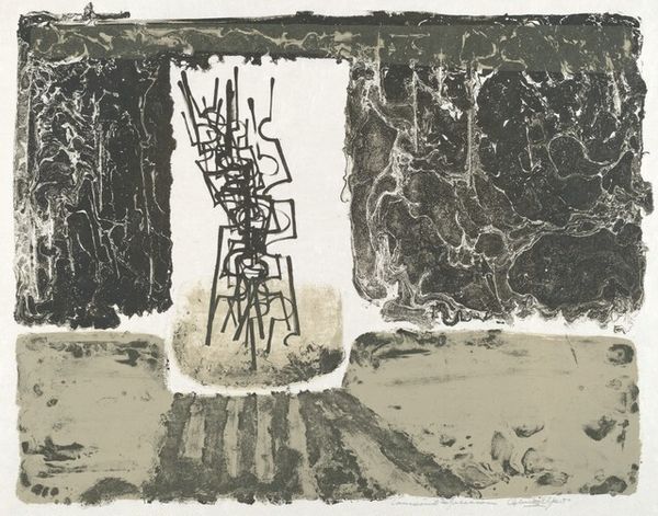 Georg Baselitz made this print, Jumping Figure, sometime in his career using what looks like a woodcut technique. The tension between the black figure and the gold background is like a dance, or maybe a brawl! Look at how Baselitz handles the material, the way he digs into the woodblock to create this image. There is a real physicality to it, a kind of rough-and-tumble energy. The gold isn't just flat; it's got a texture, a kind of grainy shimmer. It reminds me of gold leaf, but dirtier, more alive. Then there's that squiggly white line in the background, like a bolt of lightning, or maybe just a scratch, a slip of the hand. But it adds this jolt of energy, this sense of something unexpected happening. Baselitz’s crude expressionism makes me think of Munch and the way that artists keep talking to each other across time. Ultimately, it's like Baselitz is saying, "Hey, let's not get too comfortable here. Let's keep things messy, keep things real."
