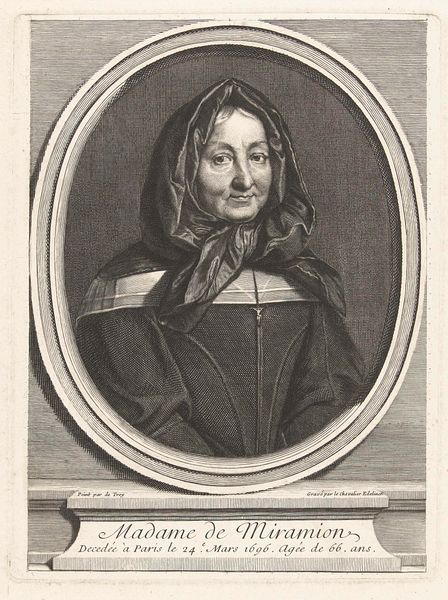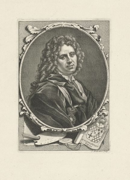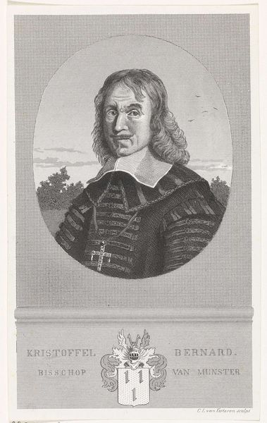 Curator: At first glance, I’m struck by the density of lines—almost claustrophobic. Editor: Yes, there is a sense of confinement even in the way the composition leads you directly into the character's line of sight, avoiding direct contact and creating this bubble of observation around them. I suppose it is indeed the nature of the portrait style in engraving. What information can you provide to illuminate its background? Curator: Delving deeper, we find ourselves face-to-face with "Portret van Jan de Bray," an engraving dating back to 1841-1842. The artist remains Monogrammist M., a somewhat mysterious figure from Germany. The piece embodies characteristics of the Baroque style. It portrays Jan de Bray, a Dutch Golden Age architect and painter who lived a couple centuries earlier. Editor: Jan de Bray's serene gaze in this piece makes me want to hear his thoughts—he almost seems detached from all the chaos suggested in those hatching marks and fine details of his garb. A fascinating way to show an older painting master through a contemporary artistic lens! Does this visual strategy convey a sense of honor and veneration for the Baroque artist? Curator: Most definitely. It’s intriguing how this anonymous German artist revives a Dutch master, linking artistic legacies across time and borders. It seems to pull forward memories of previous iconic painters in this area, like Rembrandt, Hals or Rubens. There is, therefore, an intricate web of symbolic artistic dialogue. The way he’s depicted, with that confident expression, perhaps aimed to place him among art historical celebrities! Editor: He does look like a figure in a theatrical drama. The subtle play of light and shadow reminds me of a stage setting. He's like an actor, ready to start. That gives a certain grandeur to the image. Curator: And the very fine, meticulous execution using engraving mirrors the old masters' eye for detail. It reminds me of history, and how techniques transcend across art history like visual echoes. The image serves as more than just a face. Editor: Yes, and though somewhat anonymous in the record, it reflects something so strong about artistic community.