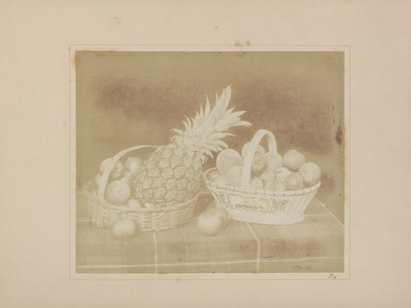 Roger Fenton's photographic still life captures a generous arrangement of fruit in a subdued palette of greys and browns. The composition centres around a lavish display of grapes, a pineapple, and various other fruits, all meticulously arranged on what appears to be a draped table. The image exudes a tactile quality, drawing attention to the textures of the fruit and the fabric beneath. In considering the context of Fenton's time, the photograph operates as a signifier of Victorian ideals and aesthetics. Fenton manipulates light and shadow to imbue the scene with a certain formality and controlled artifice. The selection and arrangement of objects are carefully considered, reflecting a preoccupation with domesticity and the abundance of nature. The photograph’s formal qualities, particularly its tonal range and balance, go beyond mere documentation. It speaks to a deeper cultural narrative about nature, abundance, and representation. The act of photographing fruit transcends its material reality, transforming it into a symbol of both artistic expression and cultural values.