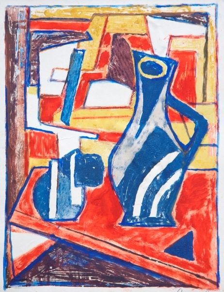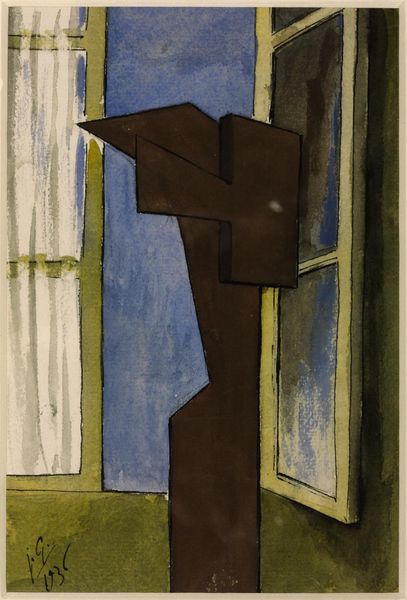 Curator: At first glance, I feel a strange serenity emanating from this image despite its cubist style; is it just me? Editor: Not at all, although initially, the fragmented forms and somewhat muted palette make me think of controlled chaos rather than serenity. For our listeners, we are observing Louis Marcoussis's "Still Life with Knife," painted in 1920, executed with watercolor techniques. Curator: Chaos? Maybe organised chaos! Look at how the painting pulls you in; my eye jumps from the sharp, metallic gleam of the knife's edge right to that cool blue bottle – what an intriguing use of color! How does this all hold together in watercolour, do you suppose? Editor: The interplay of the geometric planes and the artist’s deft handling of watercolour create an intricate layering of depth, giving the illusion of spatial complexity while adhering to the picture plane's inherent flatness. Do you notice how the materiality and composition merge? Curator: Right, it’s as if Marcoussis found some hidden magic in the way these simple materials meet. It reminds me, almost whimsically, of afternoon lunches at grandmas. He's speaking about home. I just want to figure out the symbols. Is the knife a symbol of daily ritual or is it hinting at a danger? Editor: Well, in terms of its symbolic reading, the juxtaposition of everyday objects elevates them, pushing towards something akin to philosophical rumination. Perhaps not 'danger', but some kind of transformation! It's tempting to ponder the relationship between the visible object and its geometric construction. Curator: The more I observe it, I become fixated on how its individual shapes create some very lovely relationships; a kind of strange order starts popping out! The warm browns meet the cool blues, soft blends merge against those brutal sharp lines—it just gets more intense as you keep looking at it. It almost sings, wouldn’t you say? Editor: It is precisely that tension, that interplay, that speaks volumes about Marcoussis’ ability to transform commonplace scenes into exercises in spatial dynamics and aesthetic ingenuity. A true Cubist statement if ever I saw one. Curator: Totally transformative! The emotional complexity hidden within its geometric structure is stunning; this quiet scene manages to capture feelings about home, but it seems strangely universal all at once. Editor: Precisely. Now that's an excellent way of articulating the painting's lingering pull; shall we move on?
