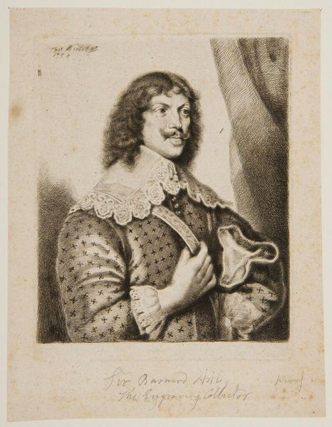 Editor: This is "Prince Rupert in His Youth," created by Ruprecht von der Pfaltz. It's a striking portrait. There's a real sense of youthful idealism, but also a hint of melancholy in his eyes. What do you see in this piece? Curator: Oh, absolutely! To me, this print whispers of a young man on the cusp of greatness, or perhaps great turmoil. The soft etching lends a vulnerability to his features, while the hat and staff suggest a readiness for adventure, for a life beyond the canvas. Editor: So, do you think the artist was trying to capture his potential, the possibilities that lay ahead? Curator: Perhaps. Or maybe they were aware, even then, of the complexities and contradictions inherent in power and privilege. He looks like he is awaiting the story that will shape his life. Editor: It’s fascinating to consider the story behind the portrait and the man. Curator: Indeed, and how art can capture the spirit of a moment, a person, and perhaps even a destiny.
