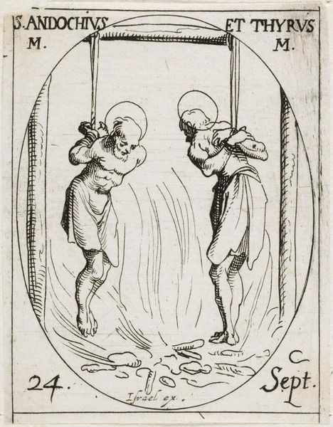 Curator: This is Jacques Callot’s "Saint Peter Preacher," held at the Harvard Art Museums. It measures about 7.6 by 4.9 cm. Editor: It's so small! And chilling – the stark contrast between the fleeing figure and the sword-wielding attacker makes it quite dramatic. Curator: Absolutely. Callot was known for his printmaking, capturing the realities of 17th-century life. The image relates to the Martyrdom Order of Saint Peter. Editor: Thinking about Callot's process—the labor involved in such detailed etching on this scale—really brings home the intensity of the scene. The material fragility contrasts sharply with the violent subject. Curator: And it’s worth considering how these images circulated, shaping perceptions of religious figures and events in the public imagination. Editor: This piece really highlights how the act of creation and its dissemination are intricately linked to the stories we tell and how we consume them. Curator: Indeed. It’s a powerful reminder that even the smallest of objects can carry immense social and historical weight. Editor: Looking at Callot's meticulous rendering, I see how his technical mastery amplifies the human drama.