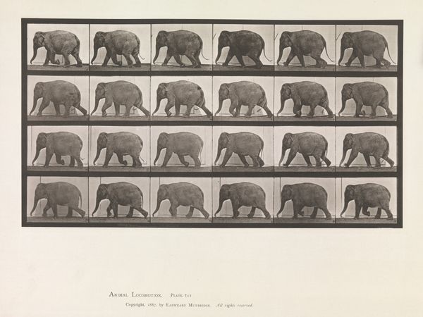 Editor: Here we have Eadweard Muybridge’s *Animal Locomotion,* specifically Volume IX, Horses, from 1887, using gelatin silver prints. It's fascinating to see the stages of movement captured so scientifically! How would you interpret this work, thinking about its broader significance? Curator: This piece isn't just about depicting a horse running. Think about the late 19th century; the question of accurate representation was raging, especially regarding motion. Muybridge's work intersected with debates around scientific objectivity, the limitations of human perception, and emerging technologies. How does this series challenge our assumptions about seeing? Editor: Well, it definitely breaks down the action into distinct moments, proving, for example, that all four hooves leave the ground at once – something the naked eye can’t perceive. But beyond that, what do you think Muybridge was trying to say about the horse itself? Curator: Consider the power dynamics inherent in observation and control. Muybridge's project, while seemingly objective, raises questions about how we categorize and dominate the natural world. How might ideas about gender, class and scientific progress influenced how and why people approached nature then? What does "progress" mean when we talk about technological representation? Editor: So, you're saying it’s less about celebrating the horse's beauty and more about a specific kind of gaze… almost a Victorian desire to dissect and understand through a very particular lens? Curator: Precisely. And let's not forget how these images were later used to inform artistic depictions. Artists used his photos as reference for realistic depiction in painting and sculpture. These "objective" images fed back into and shaped the imaginary realm. Editor: I hadn’t considered that cycle. I now see it as a piece deeply embedded in the social and technological anxieties of its time. Curator: Exactly. By situating it within the matrix of power, science and representation, we reveal how even seemingly neutral images can carry significant ideological weight.