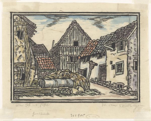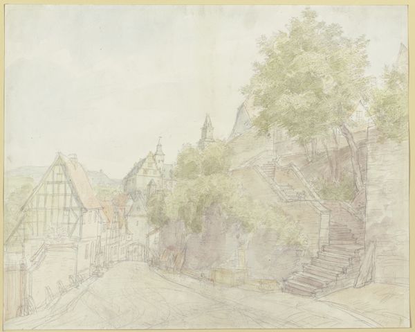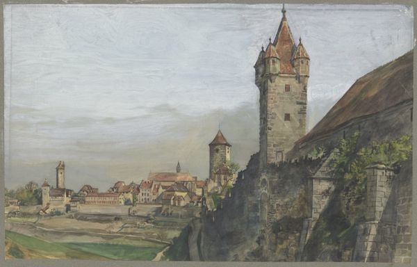 Curator: Here we have Mstislav Dobuzhinsky’s "The Blacksmith's Courtyard", painted around 1910, a mixed media piece demonstrating the artist's interest in urban landscape. Editor: The first thing I notice is its somber atmosphere. The palette is subdued, almost monochromatic, dominated by grays and browns that suggest a mood of quiet introspection. The composition is also very interesting. Curator: Indeed. Dobuzhinsky was deeply engaged with the political turmoil in Russia during this period and the social upheavals accompanying industrialisation. He often depicted urban spaces as sites of alienation and decay. Look at the architectural forms in the composition – looming, almost oppressive, structures. It's a cityscape imbued with symbolism that evokes urban isolation and social criticism. Editor: I’m more struck by the technical execution, irrespective of the social background you propose. Note the layering of watercolor and oil to create texture; see how that loaded brush adds dimension and form to the weathered buildings, and how the subtle gradations of light and shadow define the architectural space. It almost renders any social narrative invisible to me, since I’m drawn more to the materiality. Curator: But those aren’t disconnected from social concerns. The architectural forms represent a society in decline, highlighting Dobuzhinsky's vision of modernity. He offers a critique of the prevailing social order, all while showing influences from the Russian Avant-Garde in portraying the themes and topics connected to the everyday, Editor: Perhaps, but I can still approach this as pure aesthetic, even beyond that. See how the artist directs our eye to the distant spire; Dobuzhinsky uses diagonals to convey depth but also to emphasize verticality. The contrast of the spire is particularly compelling. It anchors the composition. Curator: The composition may point to a deeper symbolism, I suspect. Dobuzhinsky often expressed anxieties about social progress through his works, showing a sense of longing for a bygone era—perhaps indicated by the architectural motif that the artist subtly places on the vertical axis. Editor: And I notice again the skillful deployment of mixed media in creating a harmonious whole; but now with greater historical context in mind, I recognize what you mean concerning that societal aspect too. Curator: Exactly, analyzing his artworks requires examining both his formal approach and cultural awareness. I see them being intrinsically linked. Editor: Well, whatever its purpose and objective, I must admit Dobuzhinsky produced a fascinating formal painting with an unusual technique. Curator: And its commentary on Russia’s shifting paradigms are certainly relevant to its composition.