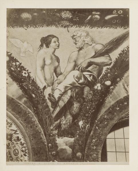 Curator: This gelatin silver print, dating from around 1870 to 1890, captures a fresco by Raphael in the Villa Farnesina, Rome. It's entitled "Fotoreproductie van fresco Venus, Ceres en Juno door Rafaël in het Farnesina te Rome," and the photographer is Domenico Anderson. Editor: Oh, what a gorgeous tableau! They seem caught in a moment of relaxed debate, maybe goddesses exchanging gossip. It’s incredibly soft, almost dreamlike. Is that intentional with the medium, this photographic interpretation? Curator: Very likely so. Photography, then and now, mediated understandings of High Renaissance masters. Anderson's photo offered wider accessibility to artworks, previously only experienced by elites on the Grand Tour. It served a crucial educational role through widespread image circulation. Editor: It gives such presence, even in grayscale. Venus especially strikes me - this beautiful curve of her body is incredible. Do you think this distribution flattens and disseminates art in good faith, though? Is it divorced from the culture from which it was conceived? Curator: That's a tightrope, indeed. Reproductions democratized access, fueling artistic studies, however simultaneously transforming these religious works into marketable commodities and stripped from their sacred locations. Editor: Yes, precisely that push-pull. How Italian Renaissance of you! To hold the divine, literally muralled and sealed within a space and only viewable under strict condition to a widely disseminated, democratized commodity. It’s interesting how that narrative can inform so much even now. Curator: These reproductions really are complex historical actors. Now that you mention it, something similar unfolds across the rest of the exhibit; images travel, gaining and losing meanings across borders. Editor: Right! Every photograph in this exhibition really prompts consideration about who got to look at what and why and when. This piece really emphasizes the shifting terrain between high art and broader publics in that sense.
