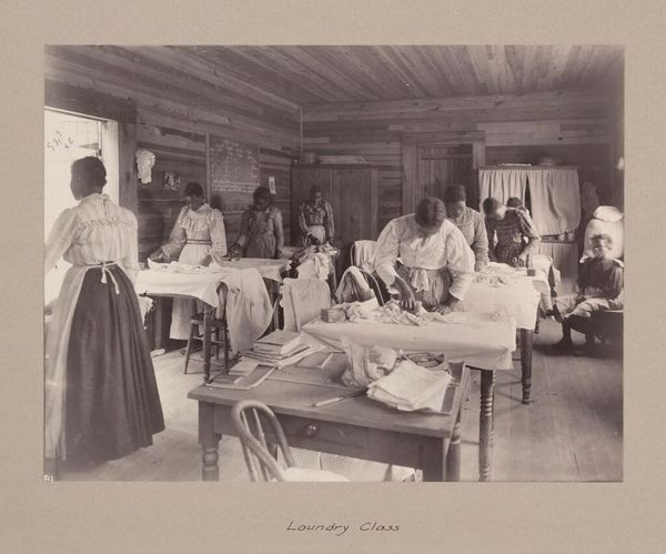 Curator: This is a photographic print attributed to Frances Benjamin Johnston, titled "Social Settlements: United States. Alabama. Calhoun. 'Calhoun Colored School': Agencies Promoting Assimilation of the Negro. Training Negro Girls in Domestic Science. Calhoun Colored School, Calhoun, Ala." Editor: My immediate reaction is how staged it feels, almost propagandistic, showing these girls in what looks like a domestic science classroom and another formal learning environment. Curator: Indeed. The photograph is part of a series Johnston created documenting educational practices, particularly among marginalized communities in the early 20th century. It reflects the complex history of educational institutions during this period. Editor: It's a visual document of the problematic assimilation projects, the intersection of race, gender, and class, and the limitations placed on Black women’s aspirations at the time. Curator: It serves as an important reminder of the challenges faced by these students. Editor: Absolutely, the picture tells a story about the past. Curator: A past we must acknowledge as we continue to shape the present.