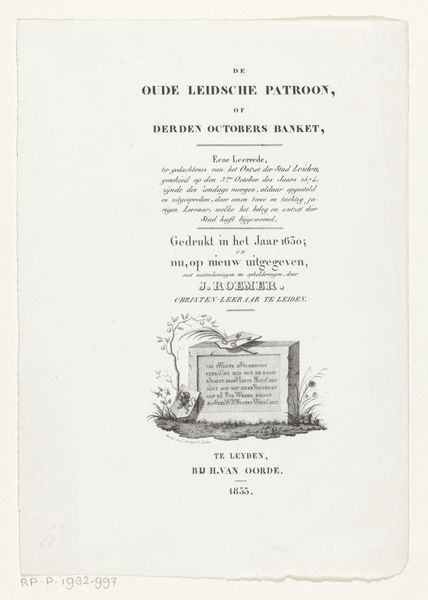 Editor: This is “Helene Grav” by Andreas Flinch, made in 1843. It’s a print using ink, likely woodcut, on paper. The mood feels melancholic and contemplative. What symbolic layers do you perceive in this composition? Curator: The funerary symbols speak volumes, don't they? Gravestones aren't just markers of death; they're palimpsests of cultural memory. Do you notice how the foregrounded stone echoes the form of a recumbent figure, hinting at eternal rest? The inclusion of seemingly natural objects transform these ordinary features into emblems of spiritual transition, each element holding psychological weight within a culture's understanding of death and remembrance. Editor: That's insightful. The way you describe it makes me think of ancient burial rituals. I also notice that inscription at the top – could that also point to additional symbolic interpretations? Curator: Absolutely. Words have the power to cement collective narratives around images. Here, the typography complements the imagery by alluding to narratives attached to Saint Helena - we could see links between historical sainthood, associated miracles, and ideas of earthly sacrifice and reward. Doesn't that contextual coupling add complexity? It reminds you that images seldom stand alone; they weave stories across generations. Editor: I see what you mean. It’s like the artist is consciously tapping into an existing cultural reservoir. Thank you! I never thought of looking at art through that angle of accumulated meaning before. Curator: Precisely. Paying close attention to how symbols operate, intersect and shift within a historical context unlocks the past's ongoing influence on the present.