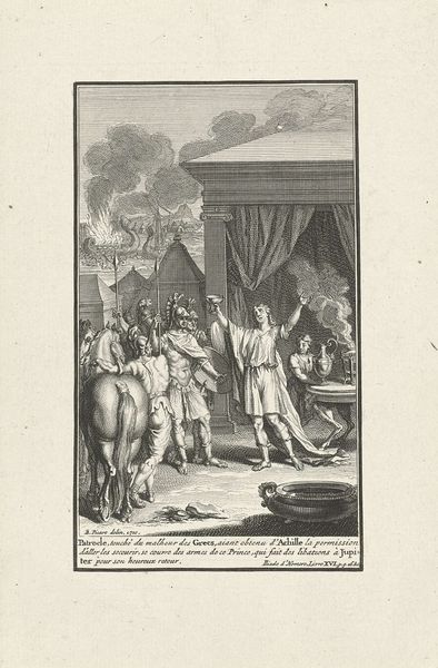 Editor: This is "Diomedes doodt Rhesus," an engraving by Bernard Picart from 1710. It depicts quite a dramatic scene from Greek mythology, full of tension and theatricality. The level of detail, rendered purely through line, is striking. What catches your eye when you look at this print? Curator: Ah, Picart! He had such a knack for capturing the essence of a story, didn't he? I’m drawn to the figures themselves. Look at the way Diomedes stands, poised with that sword – it’s brutal. And the horses in the background, restless, adding to that undercurrent of frenzied, clandestine movement. There’s almost a cinematic quality here, isn’t there? A snapshot of a pivotal moment, charged with consequences. Do you sense the anticipation hanging in the air before the deed? Editor: I do. It feels like you’re seeing the scene unfold right before your eyes. The light and shadow play such a big role in creating that tension, even though it’s just lines on paper! But I have to wonder, why this particular moment? What does it tell us about Picart or his time? Curator: Perhaps he saw in this moment something universal: the weight of responsibility, the allure and the horror of violence, and the delicate balance of fate. Picart lived during a time of immense political and social upheaval. Maybe stories like this – epic, timeless, morally ambiguous – helped him, and his audience, grapple with the complexities of their world. Think about it: we're still drawn to these stories centuries later. There’s something inherently resonant about them. Wouldn’t you agree? Editor: Absolutely. Seeing it through that lens makes the artwork feel incredibly relevant even now. I thought I was just looking at an old print, but it's a mirror reflecting something about humanity itself. Curator: Exactly! That’s the magic of art, isn’t it? It whispers across the ages, inviting us to contemplate, to question, and ultimately, to understand ourselves a little better.