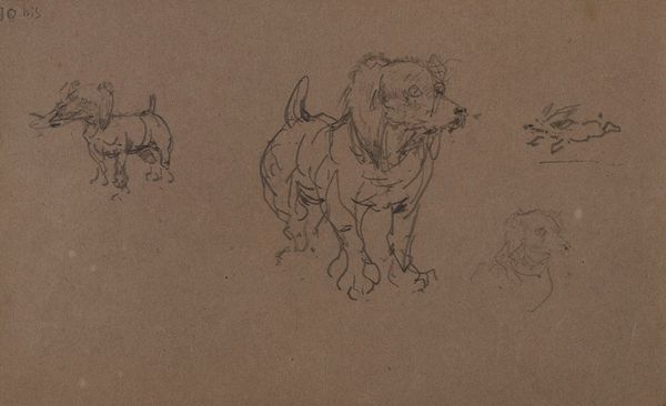 Curator: My first thought? A beautiful, gentle energy. It reminds me of turning the pages of a beloved sketchbook filled with studies. Editor: Here we have "Studies van Honden" by Pieter van Loon, created in 1839. It’s a pencil drawing on paper currently housed in the Rijksmuseum. There’s an arresting intimacy about these various depictions of dogs. Curator: Exactly! The casualness invites us to connect with each little portrait. There is something uniquely companionable to canines through time and artistic representations; though, I do spot a rogue portrait of a gentleman! What does it all mean? Editor: Considering its date, it’s tempting to view it through a lens of class and power. Dogs, historically, have been tied to notions of wealth, status, and the hunt. Note how these dogs are collared: perhaps, depictions of a pampered existence. The inclusion of the gentleman’s portrait adds a layer, suggesting a connection, or even ownership over the animals portrayed. How are humans influencing the destiny of these canine friends? Curator: That’s fascinating. I immediately thought about Van Loon developing his technique but what you suggest brings real depth. The dogs certainly seem like individuals, even characters. I love the sense of movement he captures with just a few lines! Did class constructs impact technique and creative explorations at this time, I wonder? Editor: Absolutely. Art production in the 19th century was deeply embedded within social and political hierarchies. Academic training and patronage often reinforced certain class-based aesthetic ideals, and access to subjects—even sketching dogs—would have been framed by social standing. Van Loon probably saw dogs from a privileged standpoint. Curator: Which really shifts how I look at that large seated dog! I now question what that attentive, regal bearing really entails. Thanks for helping me go beneath the initial charm. Editor: Precisely! Understanding these historical currents empowers us to engage critically with these sketches, to contemplate the power dynamics shaping both the lives depicted and the artwork itself. Art has so much to tell about society.