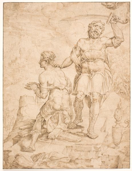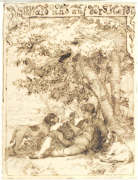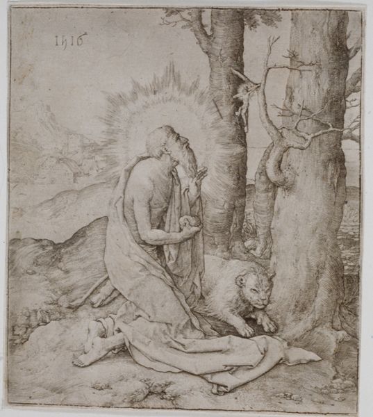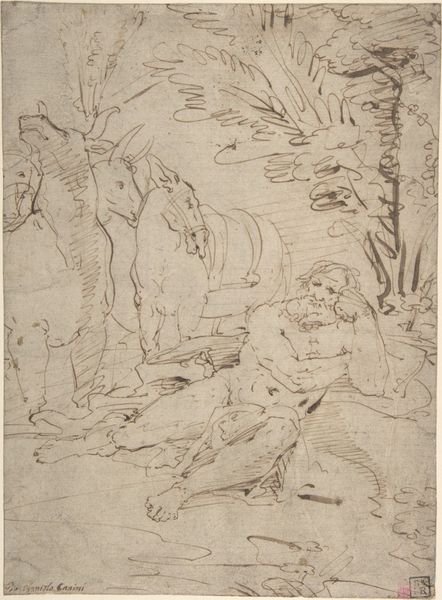 Editor: This is Domenico Campagnola's pen and ink drawing, "Saint Jerome Reading in the Wilderness," from about 1520-1525. The composition has such a sense of movement with all of the pen strokes. What stands out to you most in this piece? Curator: I’m immediately drawn to the complexities of how it situates the solitary scholar, Saint Jerome, within a potentially dangerous, untamed space. We must consider how the Renaissance idealizes a return to nature but often overlooks the power dynamics inherent in that ‘return’. Jerome isn't simply finding enlightenment; he is enacting a form of cultural dominance through his scholarly pursuit, even in isolation. Notice the lion. Editor: That's a really interesting point. I hadn't thought about it like that, but it's true; there is still a power dynamic being presented here. So, the lion is not really acting as a protector? Curator: Well, we should interrogate this perceived notion of 'protection.’ Who needs protection, and from whom? Consider that in many narratives, the wild is feminized, seen as something to be conquered and controlled. Is Jerome, with his text, enacting that control? Does the lion challenge or reinforce this notion? What readings emerge from seeing Jerome's project as a form of early colonialism on the self? Editor: So it's like, even in his solitary quest, Jerome is participating in a broader project of claiming and ordering the world. Curator: Exactly! And what does it mean that this ordering is being done through a very specific lens – that of a privileged, educated, European male? It prompts us to consider the politics embedded in the act of interpreting and documenting the world, even a "natural" one. Editor: I never would have thought to consider this piece in terms of colonialism, but I can definitely see those ideas embedded here. It definitely adds more layers to the image. Thanks for that! Curator: Of course! The drawing invites us to think critically about whose perspectives and experiences are centered in the narratives we construct about history, knowledge, and our relationship with the environment.