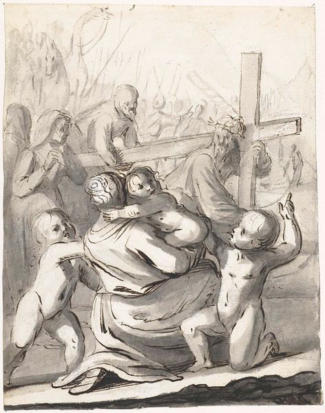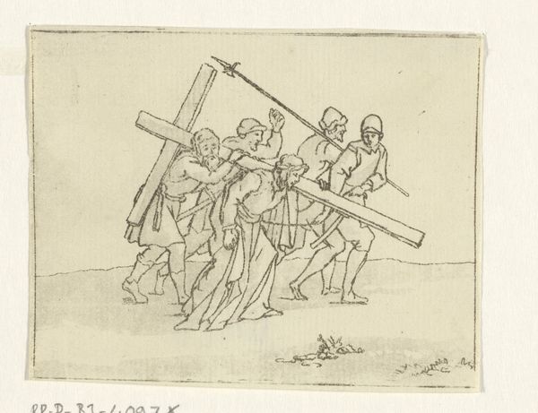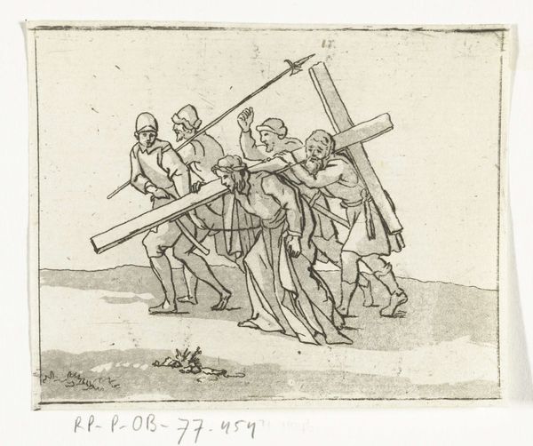 Anthonie van den Bos created this print of the "Bearing of the Cross" sometime before 1838. The use of etching allows for the story to unfold through a network of fine lines. The composition is dominated by the horizontal burden of the cross, which slices across the frame, dividing the figures. This emphasizes not only the physical weight of the cross, but perhaps the emotional and spiritual weight of the scene. The figures are captured mid-stride, yet they are bound together by the cross. The absence of color reduces the scene to its barest structural elements. Van den Bos uses line to denote form, texture, and shadow. This creates a powerful visual representation of suffering and resilience. The print invites us to reflect on the structural and emotional elements that give form to stories of faith, suffering, and redemption. We might consider how these formal choices shape our engagement with such narratives.