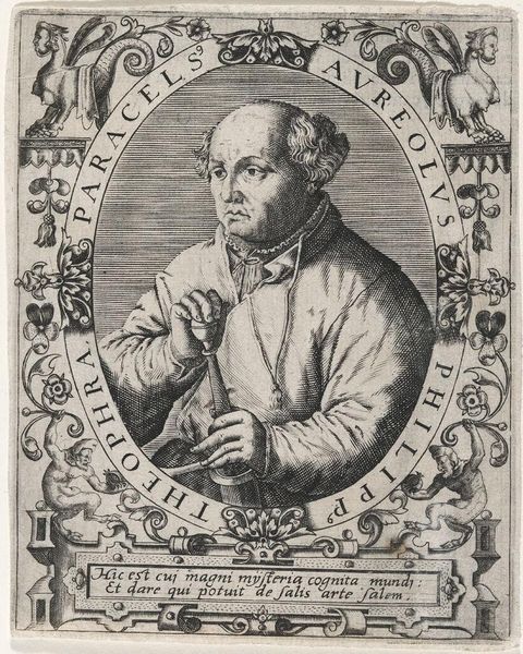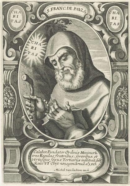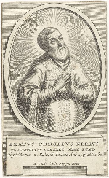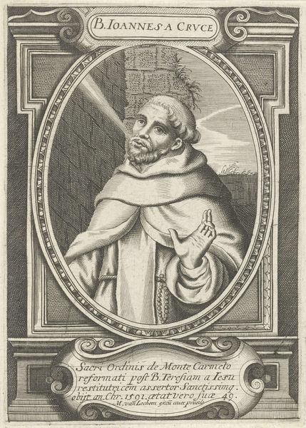 Editor: This is a print, an engraving titled "Portrait of the Augustinian Giles Colonna Romanus," created in 1636 by Cornelis Galle I. It's quite formal, even severe. What strikes you most about this piece? Curator: Immediately, I’m drawn to how this print participates in a larger system of visual representation of religious figures. Prints like these served a vital function in disseminating images of authority and piety, especially during the Counter-Reformation. Notice how the elaborate frame and Latin inscription below serve to enhance Colonna's status and legitimacy. The text specifies his positions and relations with high political actors. What statement is the artist trying to convey? Editor: I suppose it's about power and influence within the Church. Is the visual style of the baroque significant here? Curator: Absolutely. The Baroque, with its emphasis on drama and grandeur, was heavily employed by the Catholic Church to reassert its authority. Here, the intricate detail of the engraving, particularly in the frame and the subject's garments, reflects that sensibility. These visual cues solidified social hierarchies and reinforced the Church's image. How do you think people at the time might have received this print? Editor: Maybe with reverence, seeing it as a reminder of the Church's enduring power? Curator: Precisely. It’s also fascinating to consider where and how such prints would circulate. Were they primarily for private devotion, or did they have a more public function, reinforcing the Church’s presence in civic life? These are the questions we must ask when analyzing the public role of art. Editor: That’s a completely different perspective than what I usually consider when looking at art. Thank you for providing such insightful historical background. Curator: It's a pleasure to reveal the deeper implications of historical imageries. It provides a lens into the motivations behind artistic creation and its significance in contemporary society.