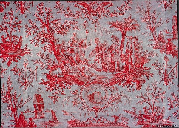 Curator: Immediately, I'm struck by the repetitive nature of this fabric panel—how each scene, though distinct, is compartmentalized. Editor: You're right. What we're looking at is "Leda and the Swan," crafted by Jean-Baptiste Huet I, between 1793 and 1803. This fascinating textile is currently housed at the Metropolitan Museum of Art. It exemplifies Neoclassical design principles. Curator: It has an almost oppressive effect with its constant, somewhat stilted representations. Almost as if the scenes of mythology were being surveilled. This red monochromatic choice amplifies a sense of restricted vision and calls up themes of colonialism. Is that meant to amplify state or spiritual control? Editor: I see what you mean, and the repetitive patterning definitely gives it a manufactured quality. It highlights the means of production. Each motif is clearly delineated, emphasizing craft and reproducibility which challenged traditional views around artistry during the Neoclassical period, doesn't it? How are the myths like those around "Leda and the Swan" translated through a process of labor intensive work that would have likely involved many skilled hands beyond Huet. Curator: I'd argue that its engagement with mythology invites critical exploration into questions of power, particularly masculine power, as the stories featured often revolved around conquest and dominance. I would also add, what sort of a narrative is built when these scenes are repeatedly placed together, with the swan and eagle juxtaposed beside Athena. How would it function in someone's home and, whose gaze is catered to? Editor: Indeed. And to delve into materiality, one has to consider the textile production of the era—the social conditions of labor involved in creating the fabric and even what dyes were available, given how its hues shift based on textile treatment methods of the time. How would such fabric speak of gender roles through not only it's decorative nature, but the material makeup that determined how it appeared. Curator: Yes. As such, its value shifts between decoration and political material depending on its contextual engagement in discourse about social norms and power struggles of its time and ours. Editor: Absolutely. When considering design practices that brought "high" art into everyday domestic life through these reproducible means we gain an even richer awareness of those very dynamics. Curator: Indeed! Editor: That's right!