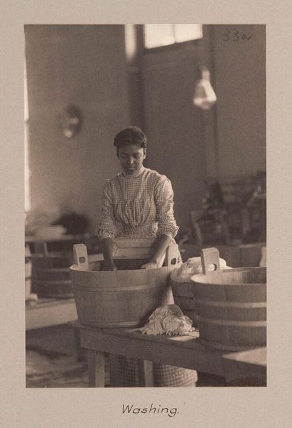 Editor: This photograph, by Frances Benjamin Johnston, shows a woman mattress making at the Hampton Normal and Agricultural Institute. There’s a quiet dignity to her work. What strikes you when you look at this image? Curator: It’s a study in contrasts, isn’t it? The stark institutional setting versus the intimate, almost domestic act of crafting a mattress. I wonder, what dreams will this mattress hold? What stories will it absorb? Editor: I hadn't thought of it that way, of the mattress holding dreams, but that's a lovely point. It makes me see her work as more than just labour. Curator: Exactly! Johnston captures a moment brimming with potential, both for the individual and a community striving for something more. It really gives you pause.