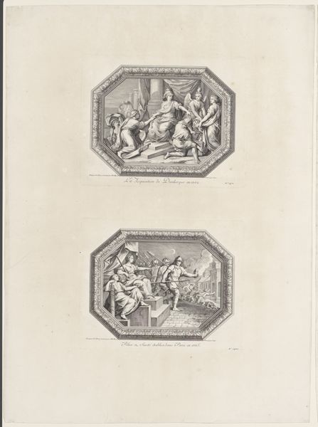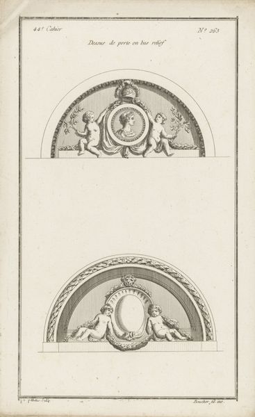Jean Pelletier produced this print, "Rookvat, wapens en medaillon," likely in the 18th century, using etching. Its symmetrical composition is immediately striking, dividing the image into distinct upper and lower registers, each filled with meticulously detailed ornamentation. The monochromatic palette enhances the formal qualities, emphasizing line and texture over color. The upper section presents a classical still life with smoking urns, weapons and medallions, evoking a sense of ceremonial formality. Below, a semi-circular medallion depicts classical figures; flanking it, two seated women are framed by laurel wreaths, suggesting themes of peace and prosperity. The print reflects the Enlightenment era's fascination with classical antiquity, and the rational organization of space. Consider how the print’s balanced structure embodies the Enlightenment ideals of order and reason, while also functioning as a visual text ripe for interpretation. Its detailed craftsmanship and carefully arranged forms invite ongoing appreciation of its aesthetic and cultural significance.