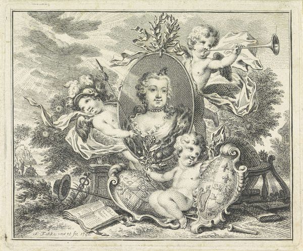 Curator: Look at this charming engraving, “Twee putti met buste van Pan en bijenkorf in cartouche,” or "Two Putti with a Bust of Pan and Beehive in Cartouche" by Abraham Delfos, likely created between 1741 and 1820. What strikes you? Editor: The elaborate ornamentation immediately grabs attention, doesn’t it? The fine linework gives a sense of delicacy, but there is also a surprising level of busyness to the composition with all the swirling details in such a contained format. Curator: Precisely! That “busyness,” I would argue, isn't merely decorative. It's indicative of the period’s fascination with allegory. The putti, the bust of Pan—a symbol of nature and fertility—and the beehive all suggest layered meanings, perhaps touching on themes of prosperity, abundance, and the rewards of labor. Editor: I can see that. But the symmetry here also points to a deeper conceptual framework, doesn't it? Note how the artist uses balanced shapes, rhythmic lines, and alternating textures to bring focus to the central bust of Pan. The flanking putti operate almost as visual echoes. Curator: Indeed. Consider, though, the societal context. These idealized figures were not merely aesthetic choices but reflections of the era's class structure, notions of beauty, and ideas about innocence. The artwork, intended as a miniature print, served a purpose for circulating ideas among an elite class of patrons. Editor: The contrast between the meticulously rendered details and the almost careless background shading is really striking as well, particularly as it sets off the idealized cartouche elements in the front. I find myself wanting to know why the artist prioritized some aspects over others. Curator: An excellent point. Delfos invites the viewer to partake in the visual codes emblematic of the era’s beliefs. And through their accessibility as prints, images like this became tools that bolstered social ideologies related to labor and reward. Editor: The image's focus, ultimately, is about achieving balance. Balance within its own visual structure but perhaps a larger argument about nature and progress during the Enlightenment. Curator: A society always in flux! We can, regardless, glean a perspective on their priorities via art like this, even today.